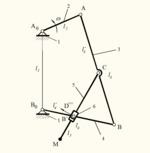 The mechanism contains a four bar linkage kinematic chain connected in parallel with a slider crank. The kinematic chain RTR´s joints are connected with the coupler and rocker of the four bar linkage. By means of changing the geometrical lengths of the mechanism´s links the coupler point M describe a range of coupler curves. |