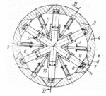 Reprezentare in sectiune cu un plan orizontal a aceluiasi dorn cu segmentii deplasati spre exterior in pozitia de lucru, conform inventiei. Parte a patentului - Dispozitiv pentru fasonarea mufelor |