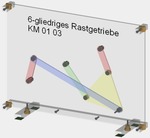 - Ein Punkt eines ebenen sechsgliedrigen Kurbelgetriebes wird auf einer Koppelkurve geführt. Das im Gestell gelagerte Abtriebsglied weist zwei Rasten durch genäherte Kreisführungen mit gleichen Krümmungsradien auf.