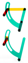 Entwicklung der exzentrischen schwingenden Kurbelschleife, die im Modell unten angeordnet ist, aus der im Model in der oberen Hälfte dargestellten Kurbelschwinge (2. Bauform)