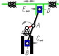 Mechanisms: Lösungsvariante 6 zur Struktursynthese-Aufgabe durch Kombinieren der Gelenkarten der Grundbauform in Bild 3.39b (Lehrbeispiel 2.12)
